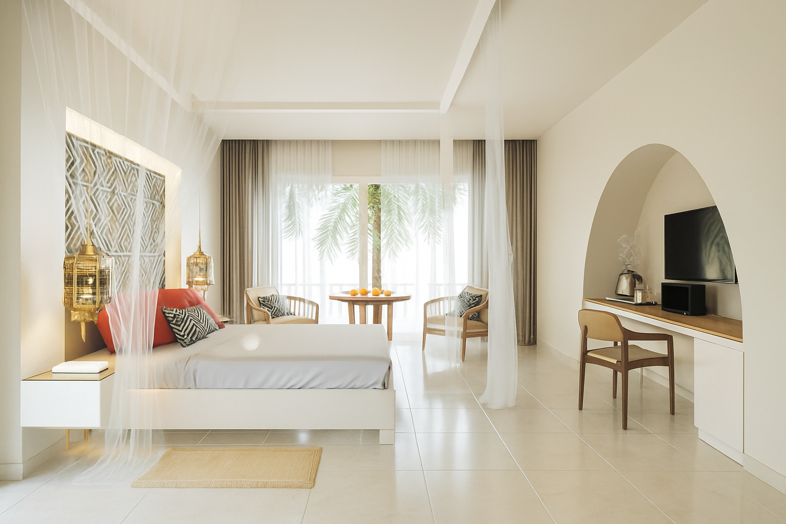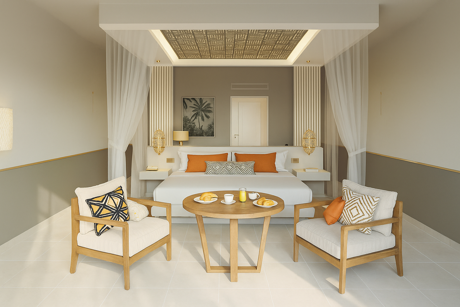 Enjoy elegance and comfort in our Suite Room, featuring a spacious bedroom, stylish decor, and a private terrace with garden or ocean views. Perfect for couples seeking a relaxing Zanzibar escape.
